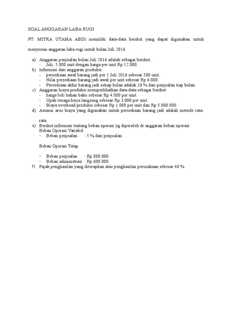 Contoh Kasus Anggaran Laba Rugi from ibfgi.com Check spelling or type a new query. We did not find results for: Maybe you would like to learn more about one of these?