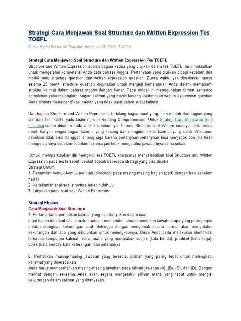May 29, 2015 · toefl mencakup empat aspek yaitu (1) listening comprehension, (2) structure and written expression, (3) reading comprehension, dan (4) test of written english (twe). Toefl structure & written expression, (2) bonus: This section is divided into two parts, each with its own directions. __________ peaches are classified as freestone or clingstone depends on how difficult it is to remove the pit. Paket soal 1 gratis untuk siapa saja, sementara paket 2,3,4,5 hanya untuk premium user.